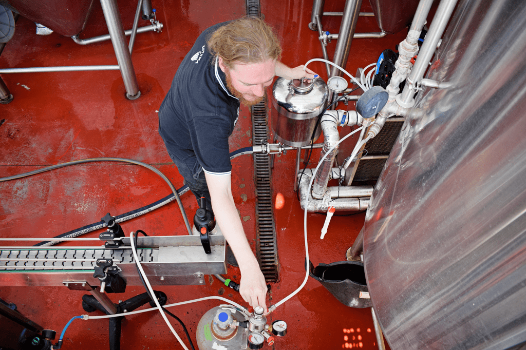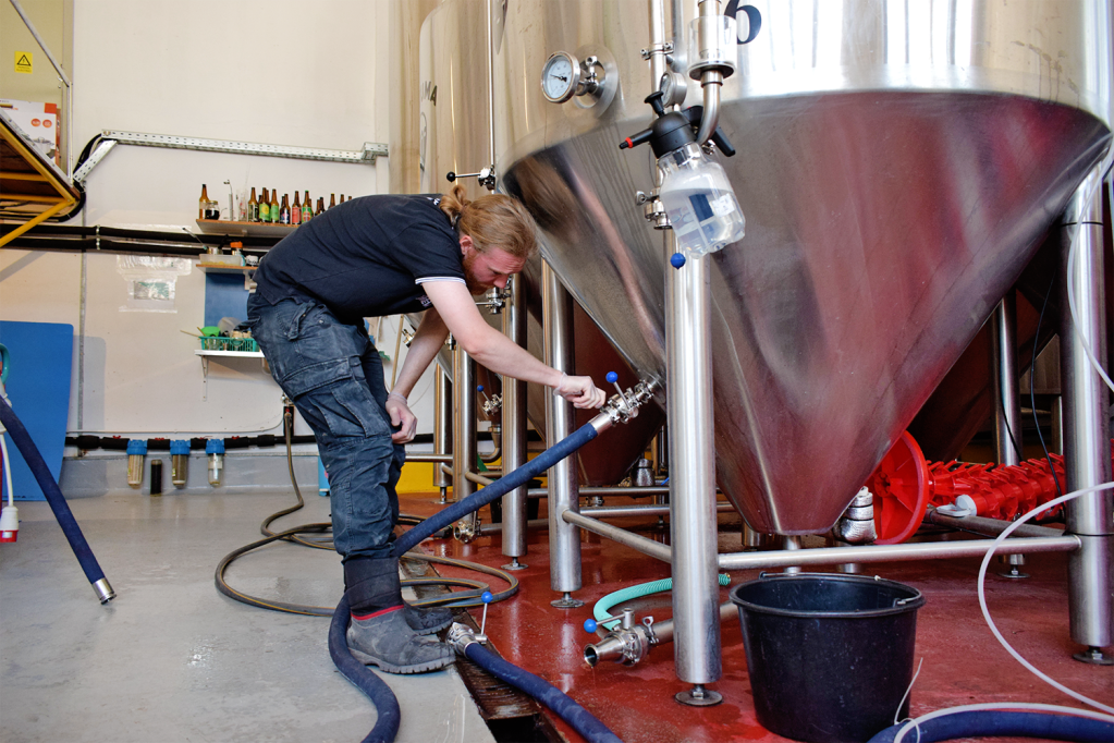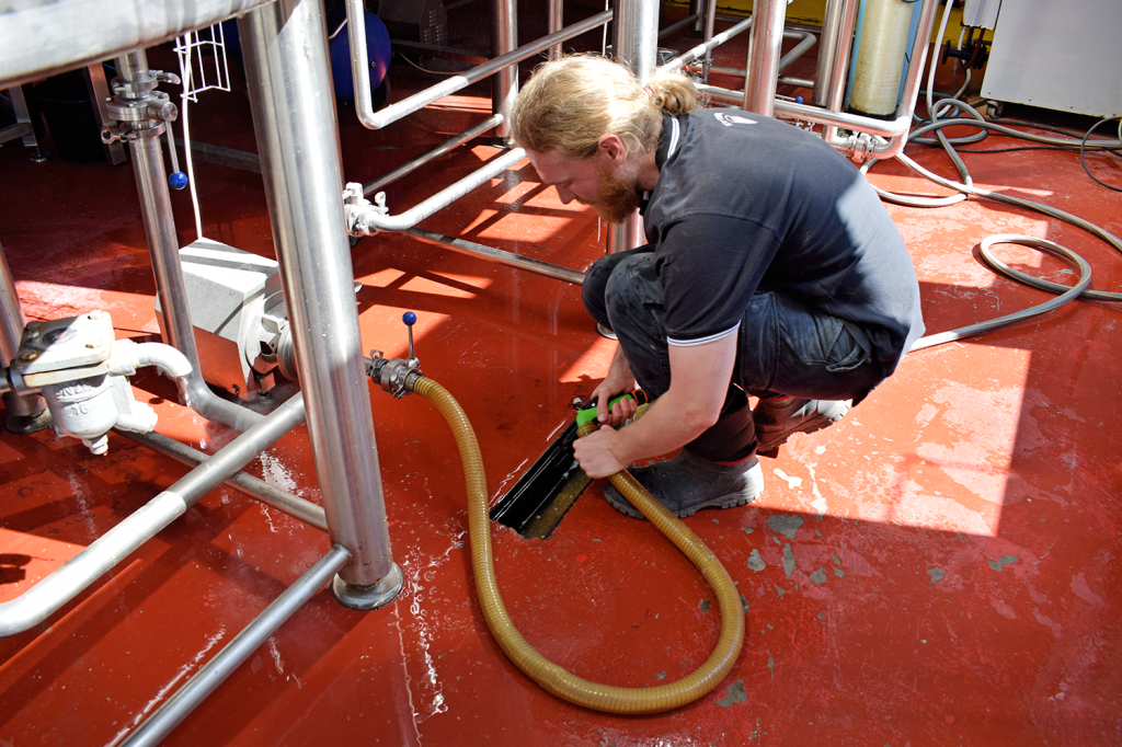 Once it’s all been put back together again, sanitizing acid is pumped into the fermenter, then recirculated at high pressure for around an hour. We use a low concentration of acid that will kill off germs and bacteria, but doesn’t need to be rinsed off. This is essential, as most tap water contains microscopic bugs that can harm your beer later on, so if you rinse your acid off with plain water, you’re effectively soiling your tank once again.