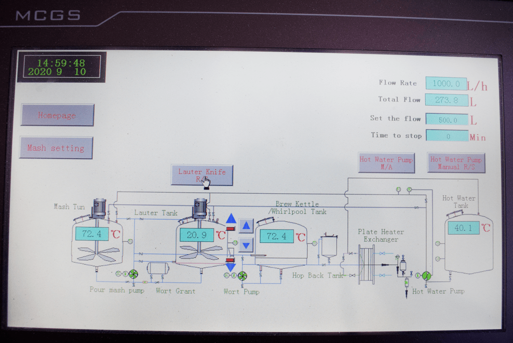 First thing we notice as the brewing software boots up is that the strike water is a little too hot. We’re planning to mash in at 65℃, which means on this equipment, the strike water should be about 72℃. Right now we’re at about 80℃, so cold water is added to the hot liquor tank to lower it.
