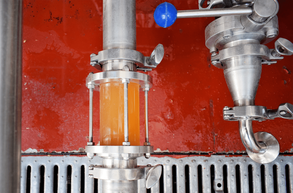 Before starting the run-off into the boil kettle, we take a gravity reading to see how successful the conversion was. At 1082, we’re happy with the first runnings, and can more accurately calculate how much sparge water to add. Once the gravity reading is taken, the boil kettle valve is opened, the pump is slowed down, and the hot wort steadily runs into the kettle.