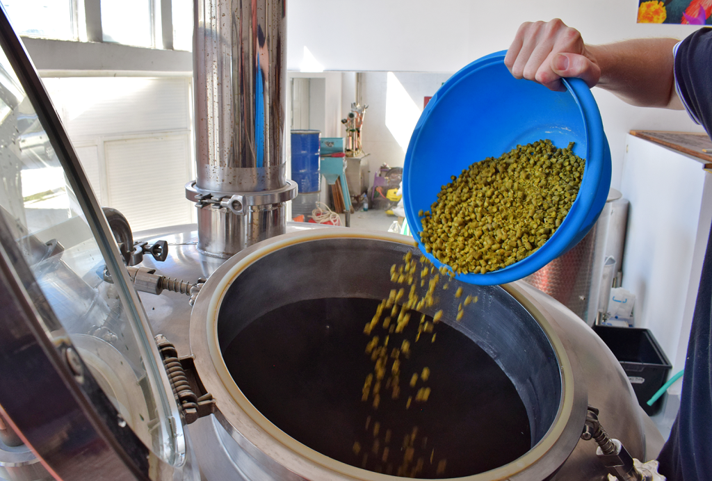Although Andy usually handles the brew day on his own, as the head brewer, Norbert will pop in to make sure that everything is going smoothly, and to go over any details in the process. He’s also in charge of designing the recipes, and for today’s brew, he was the one who went out and picked up the fresh hops.