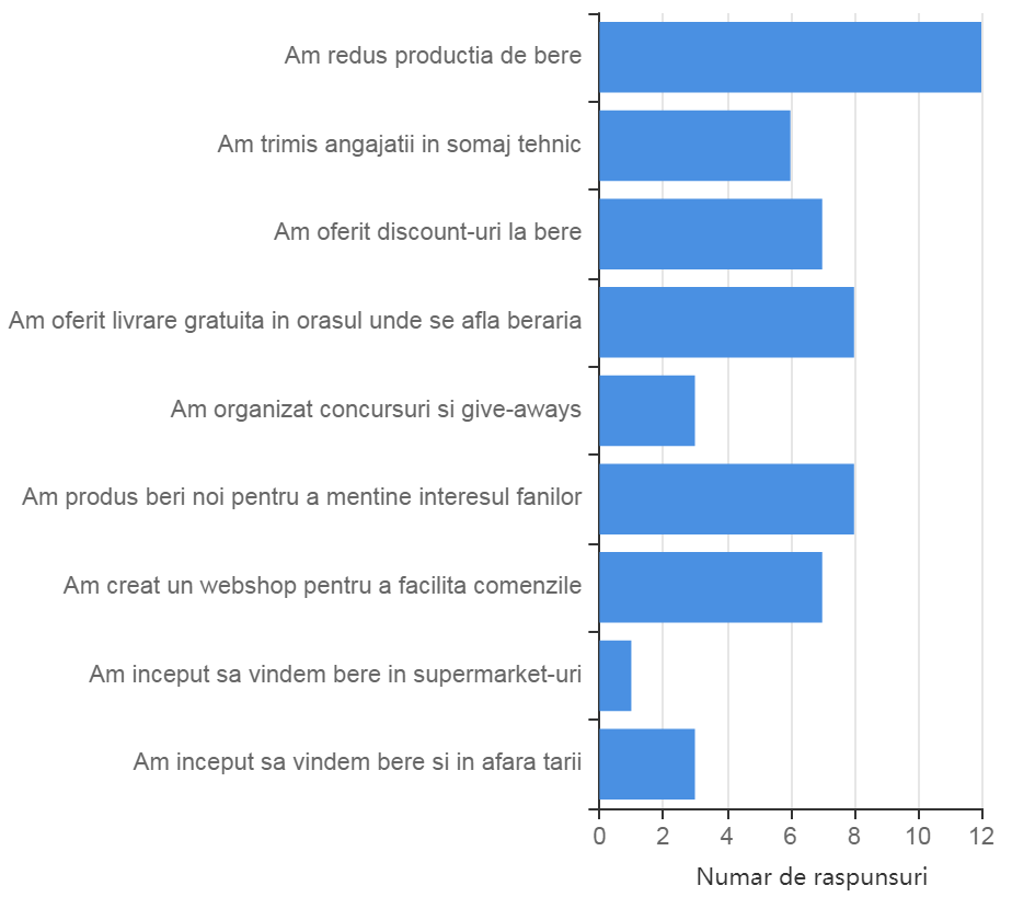 Trebuie avut în vedere şi faptul că în relația dintre berari și HoReCa lucrurile nu stau mereu bine și frumos. Când am întrebat berarii dacă barurile și restaurantele și-au plătit facturile în termenul standard de 30 de zile, doar 11.8% au spus că da. 52.9% au spus că facturile le-au fost plătite după 30 de zile, iar 35% au spus că au facturi restante încă de dinainte să intre în vigoare starea de urgență. Când am întrebat berarii dacă au continuat colaborarea cu barurile și restaurantele care nu si-au platit facturile la timp, răspunsurile au fost destul de egale: 47% au spus că continuă să le vândă beri, în timp ce 41.2% au spus că au oprit aprovizionarea.